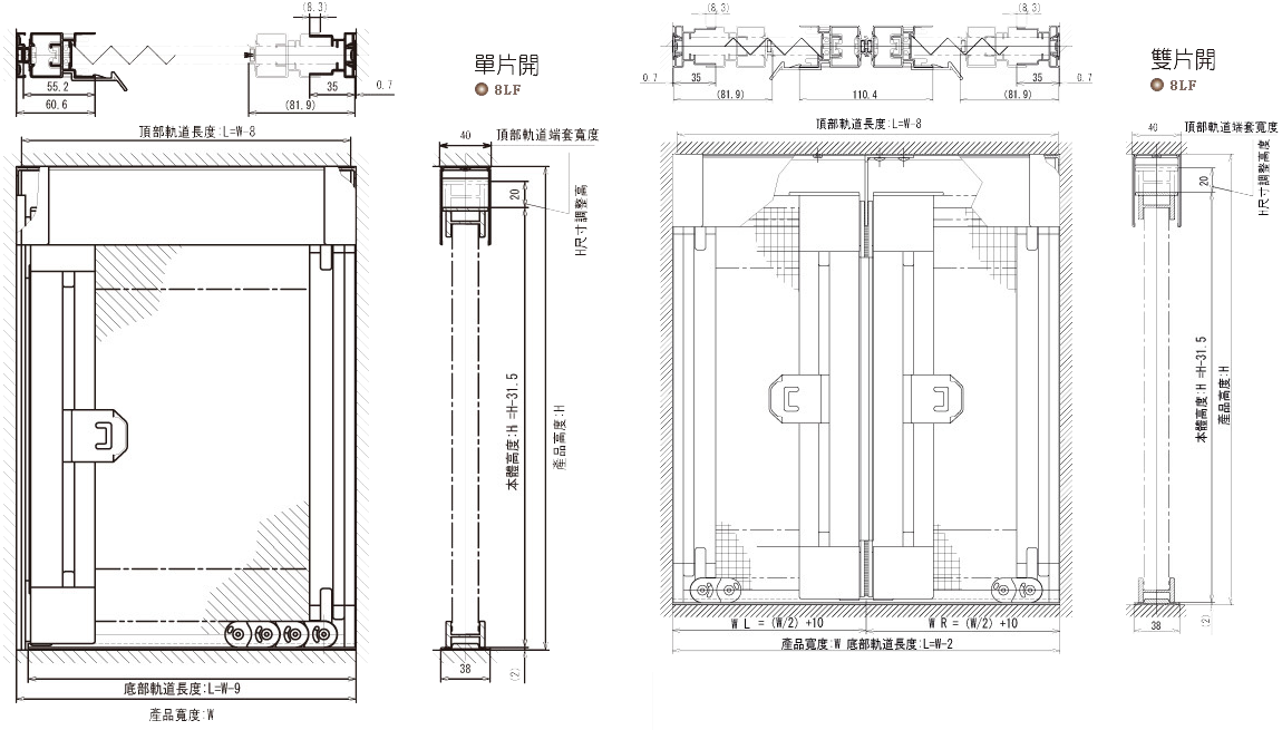 註)上框及下方軌道可已裁切長度,在高度方向則有20mm向下的調整空間。