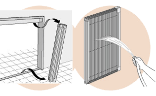 將紗門本體自固定框架取出,紗網上髒汙處以清水清洗即可。