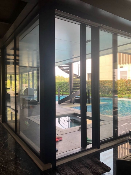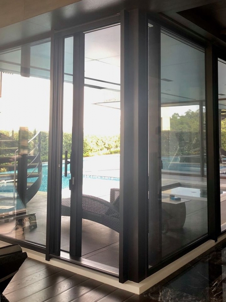 泳池正面[寬版雙開]紗門安裝完畢-紗門完全開啟